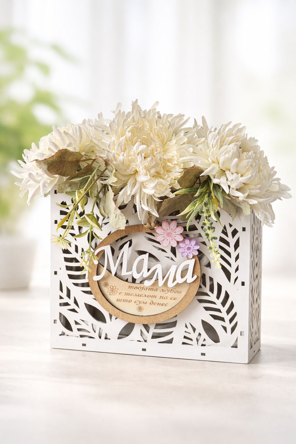 Достапна е и декоративна кутија, дрвена изработка, која е препорачлива како комплетен подарок или за цветен аранжман. Цената на кутијата е 550 ден.