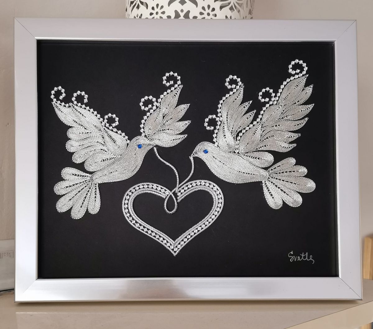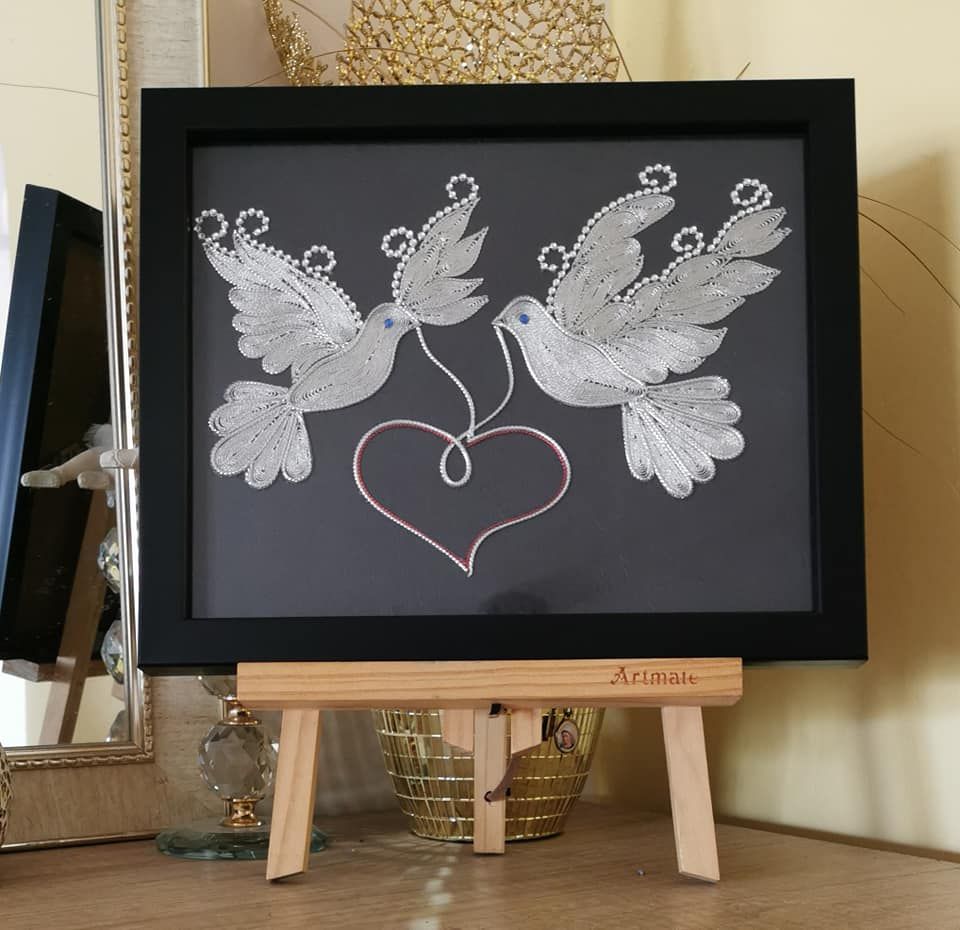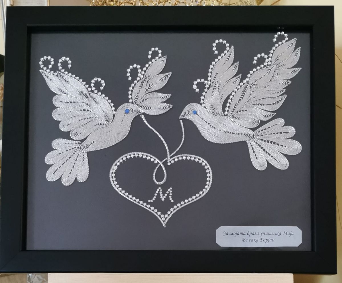 Со љубов рачно изработена слика филигран од срма, со мотив „Пар гулаби со срце“.