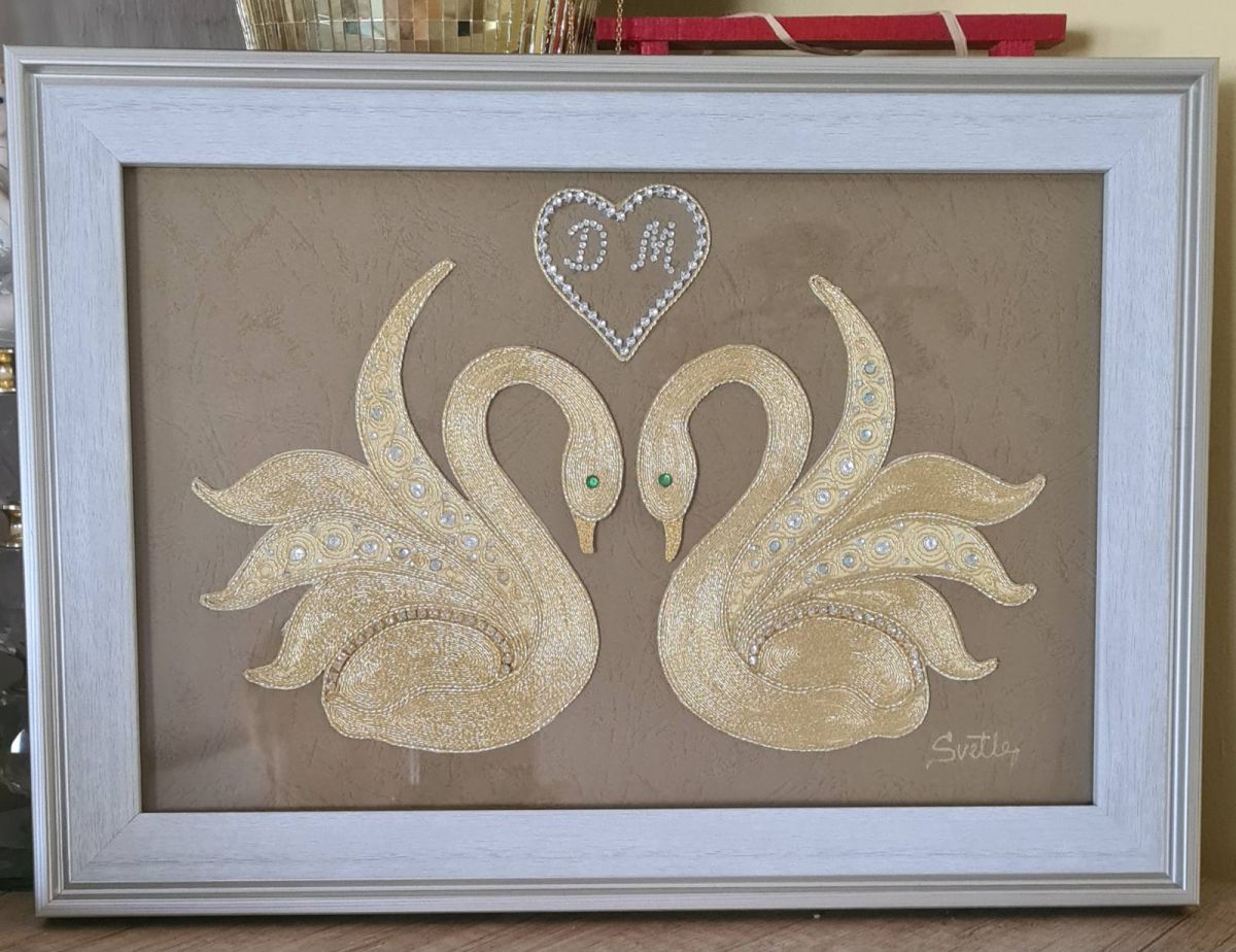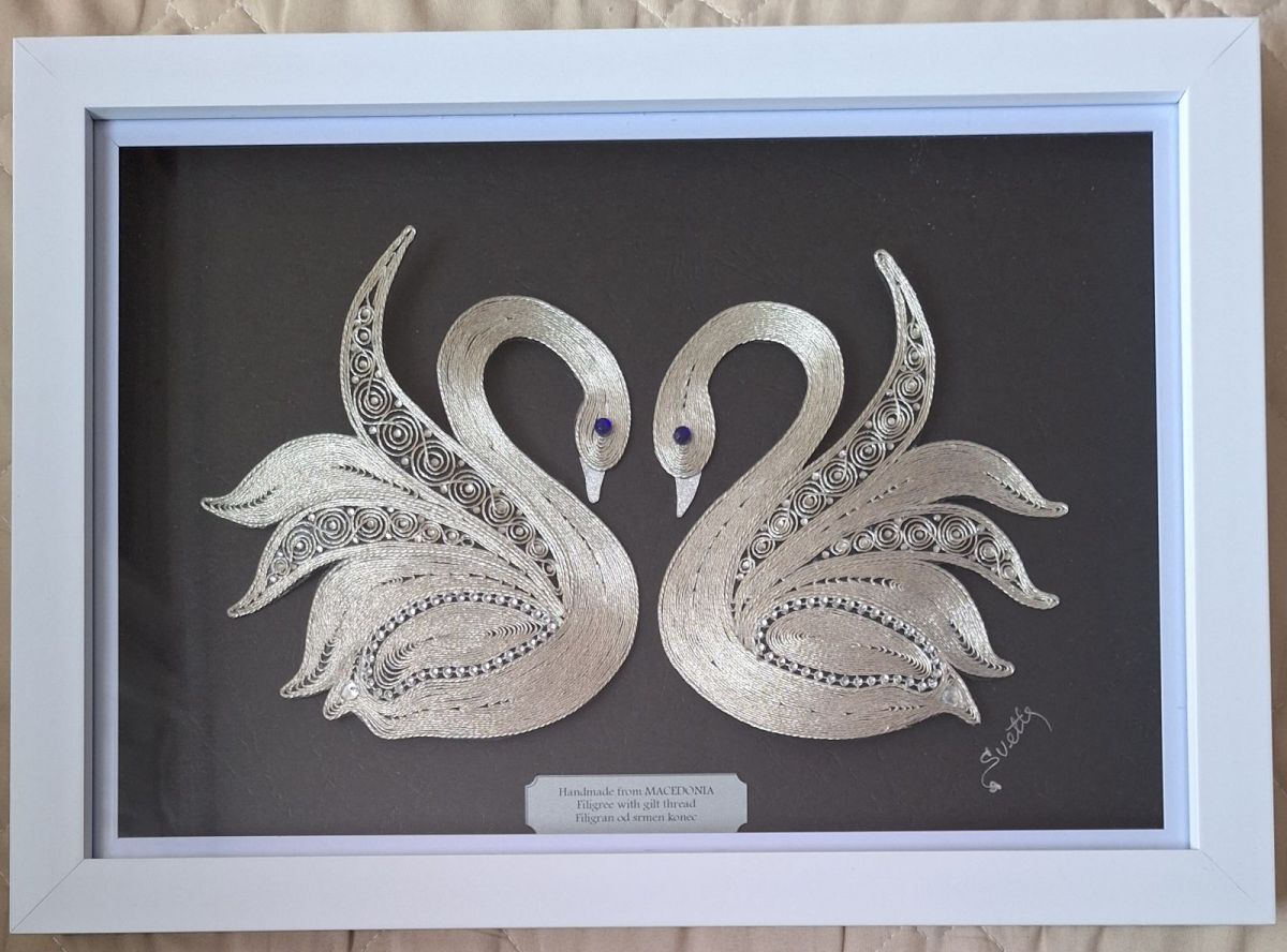 Со љубов рачно изработена слика филигран од срма, со мотив „Пар лебеди“. Може да се изработи во златна или сребрена боја.