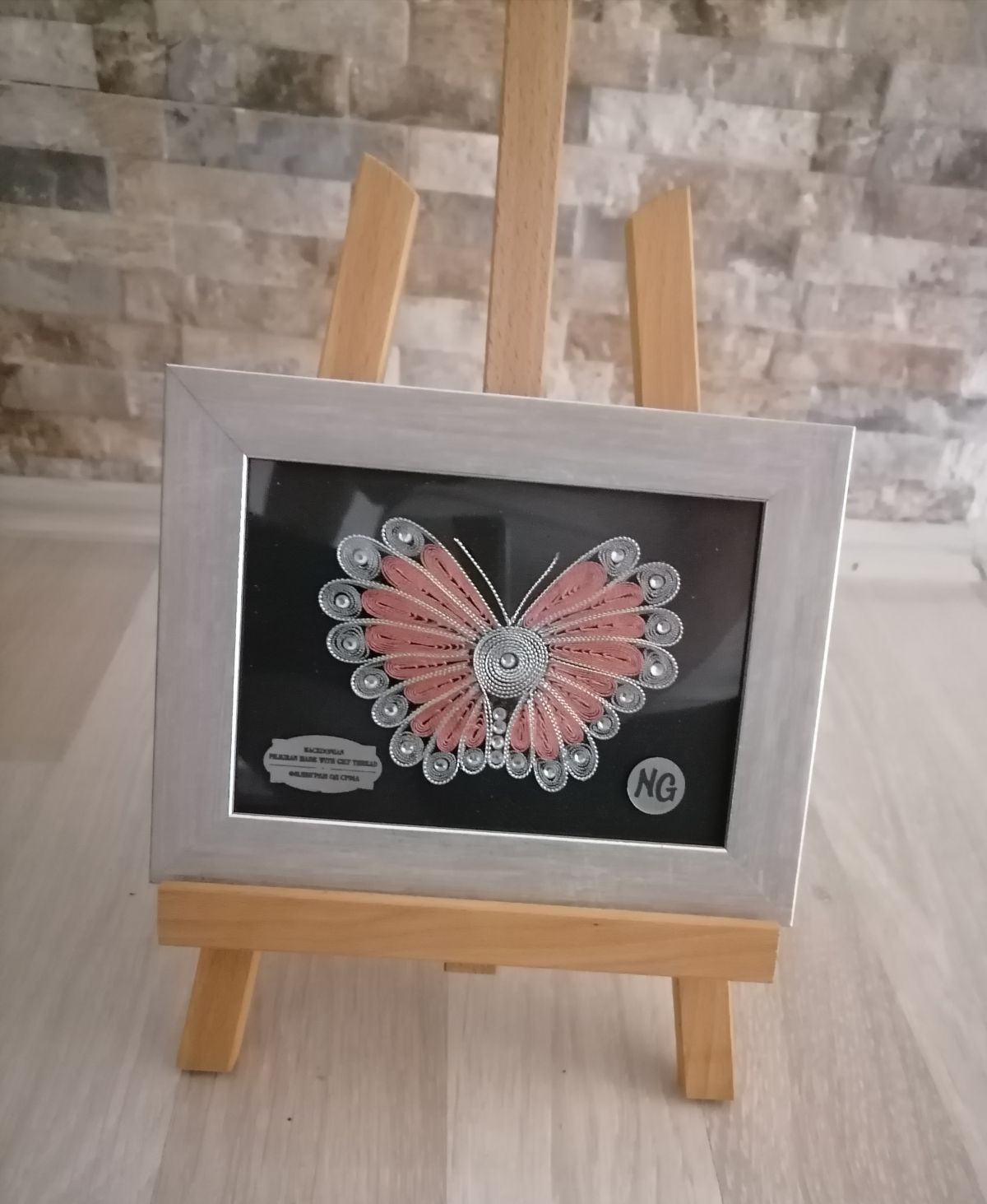 Елегантен брош од срмен конец Направен е на дрвена подлога Спакован е во соодветна кутија на накит.