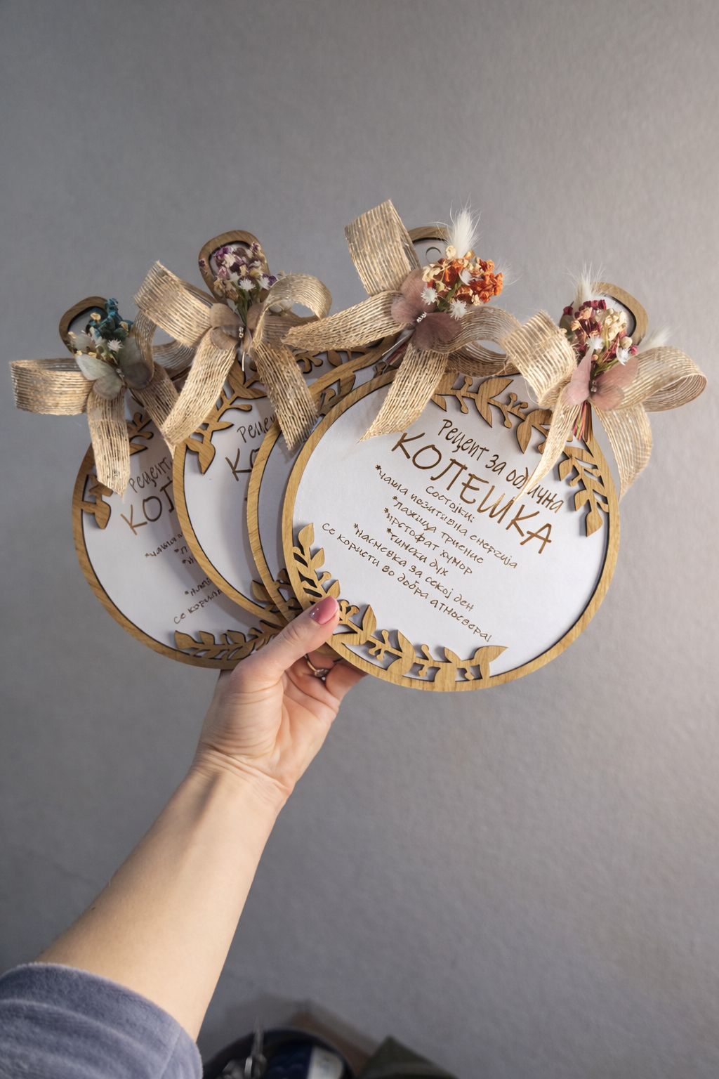 Декорирани со суво цвеќе и машна, спакувани во кутија — подготвени за подарување.