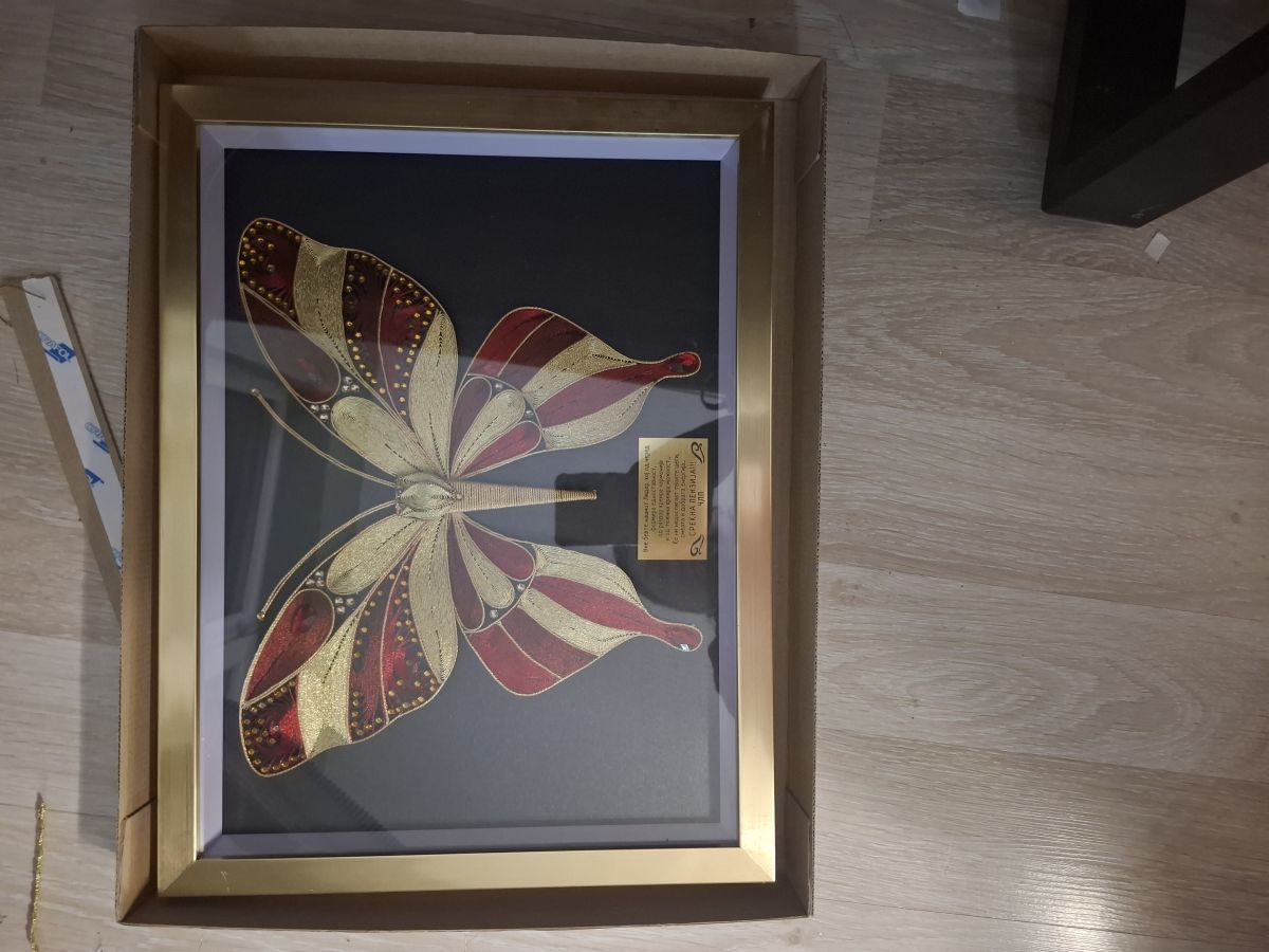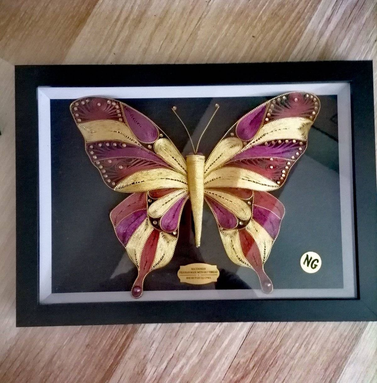 Пеперутка со мотив од македонското знаме, изработена во филигран техника со срмен конец. Долготраен производ кој е уникатен и доста модерен.