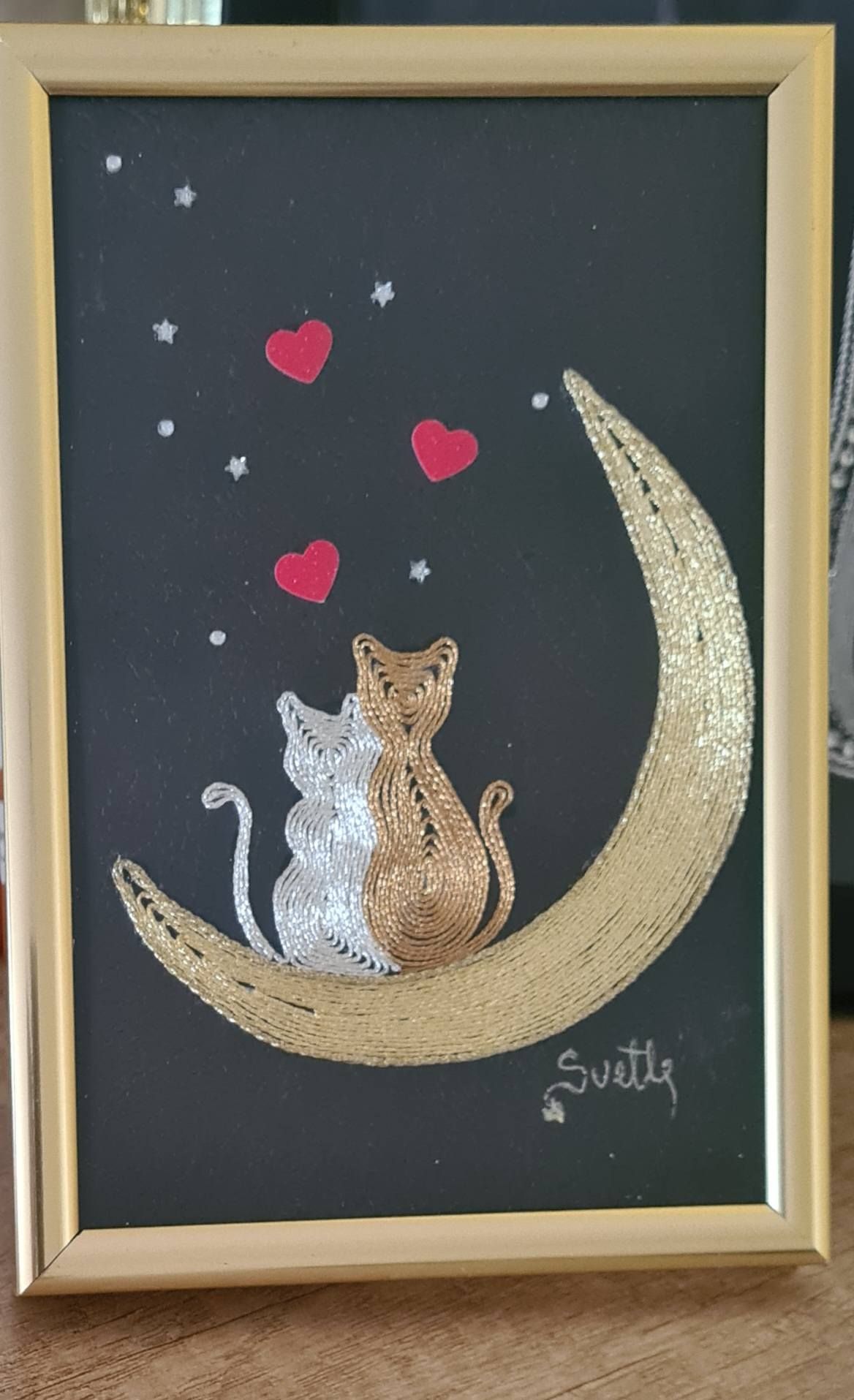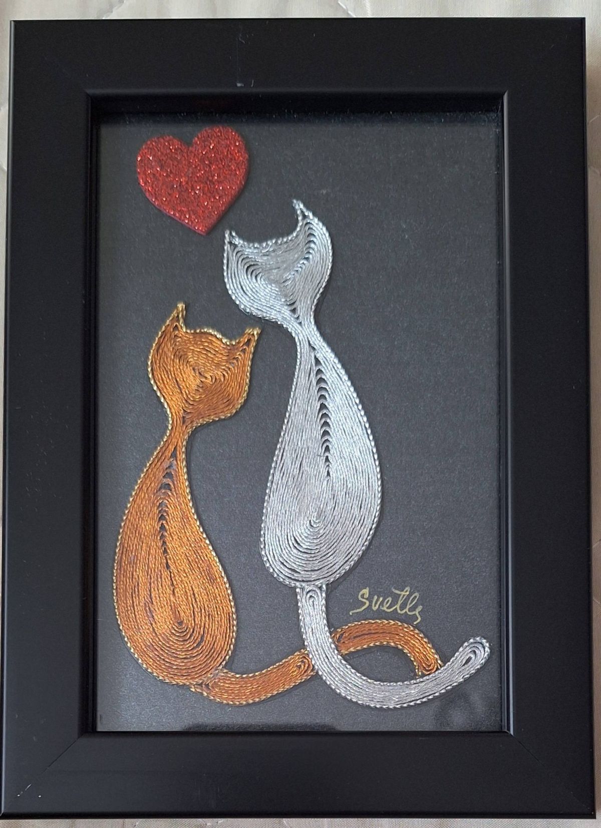 Со љубов рачно изработена слика филигран од срма, со мотив „Вљубени мачиња“. Може да се изработи во златна или сребрена боја.